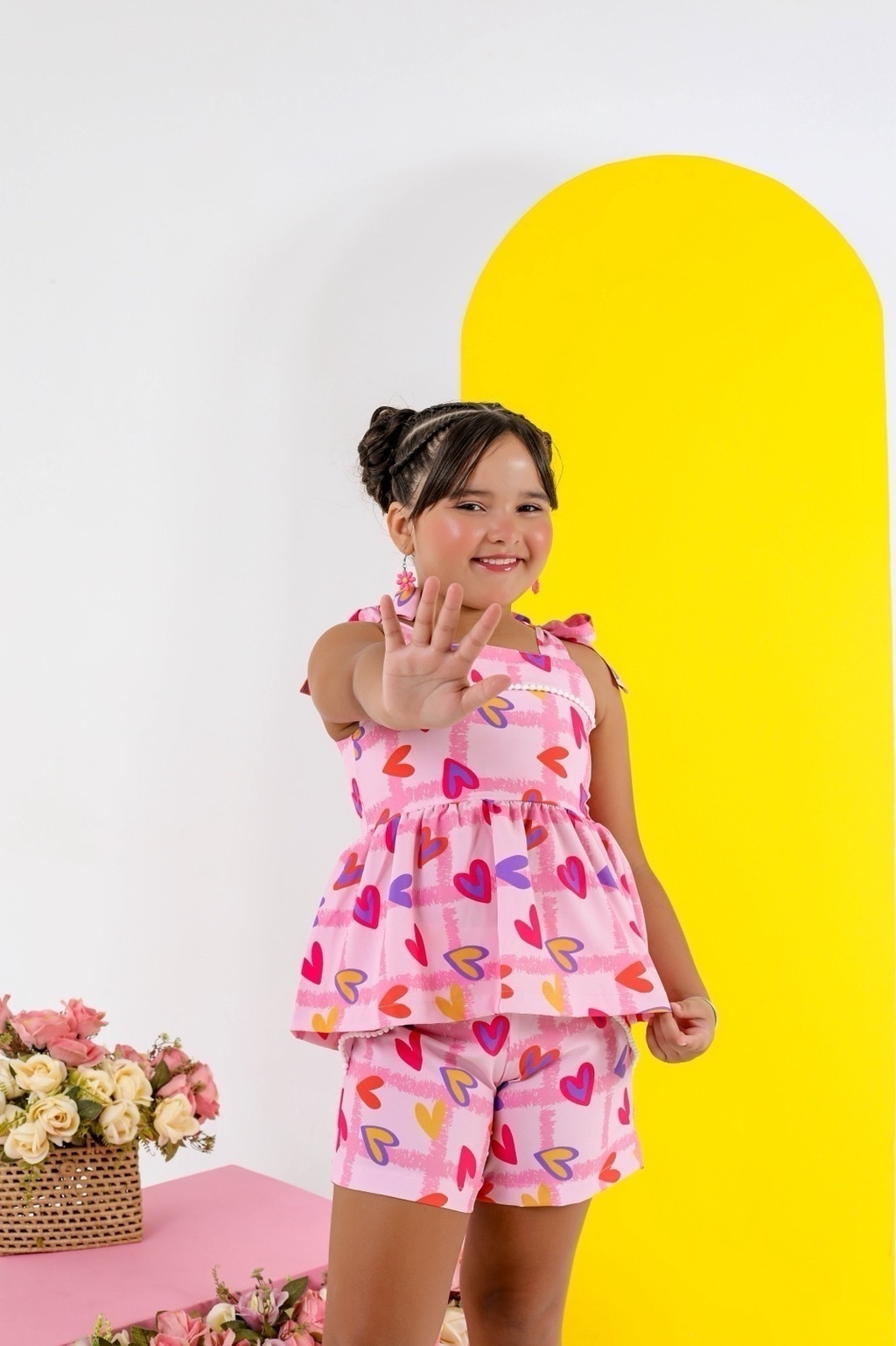 ✨ Conjunto Coração! Surpreenda sua pequena com o charme do Conjunto Coração! Composto por blusa e short em tom rosa delicado, realçados por detalhes de coração vermelho que encantam a todos.